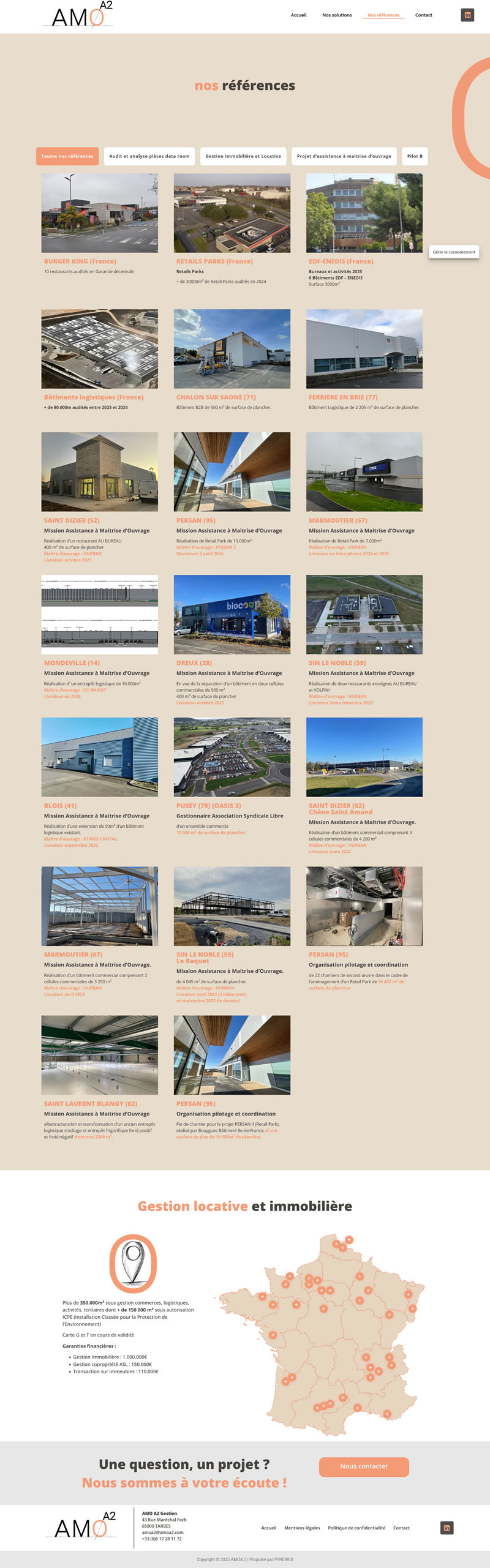 L’identité visuelle, volontairement sobre et moderne, reflète la fiabilité et la rigueur d’AMOA 2. Les contenus ont été structurés pour mettre en avant leur savoir-faire à travers des descriptions précises, une présentation claire de l’équipe, ainsi qu’une section dédiée aux références, illustrant leurs projets menés avec succès.
