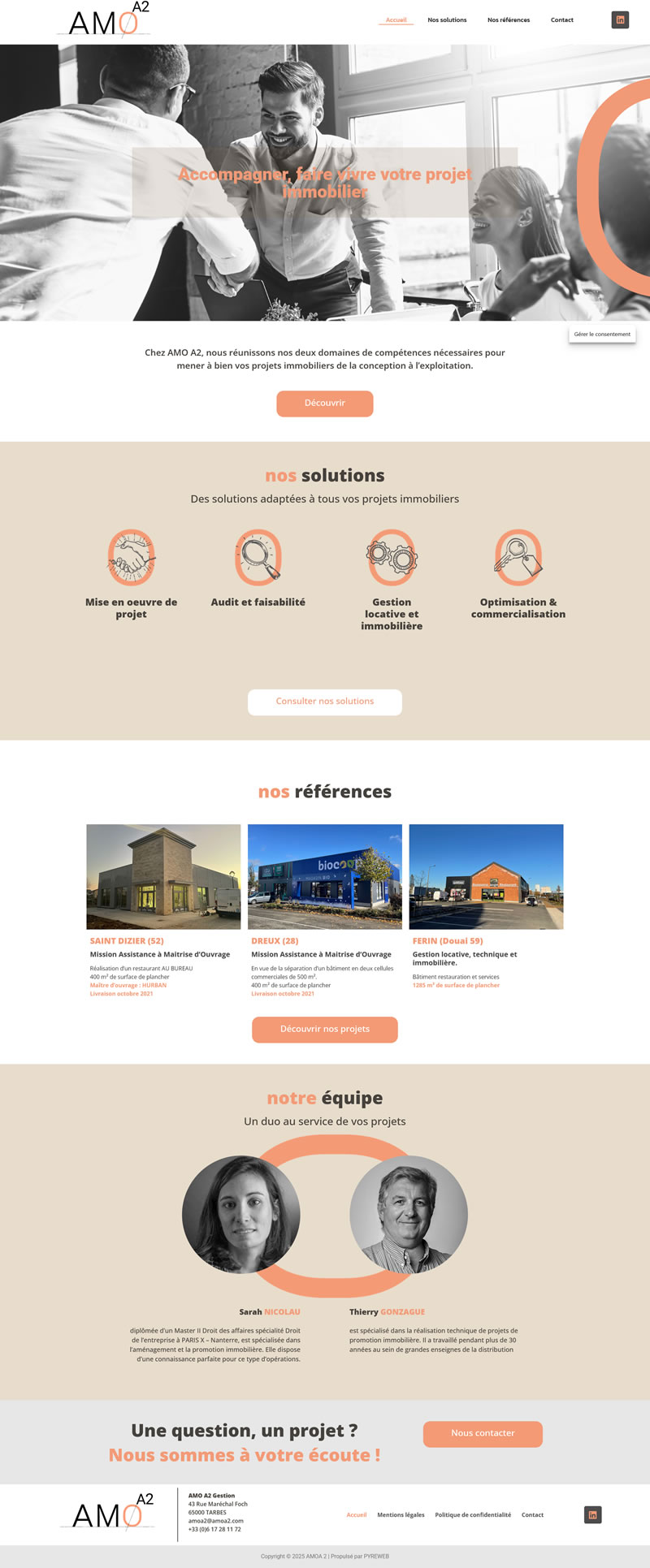 Pyreweb a accompagné AMOA 2 dans la création complète de leur site vitrine, avec l’objectif de valoriser leur expertise en assistance à maîtrise d’ouvrage et en gestion de projets immobiliers. Le site propose une navigation simple et intuitive, pensée pour guider rapidement les visiteurs vers les services clés : audit et faisabilité, pilotage de projets, gestion locative ou encore optimisation commerciale.